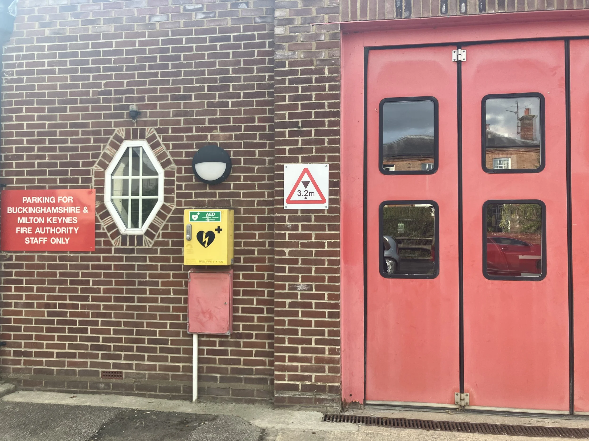 The yellow AED cabinet on the front wall of Brill Fire Station in Temple Street